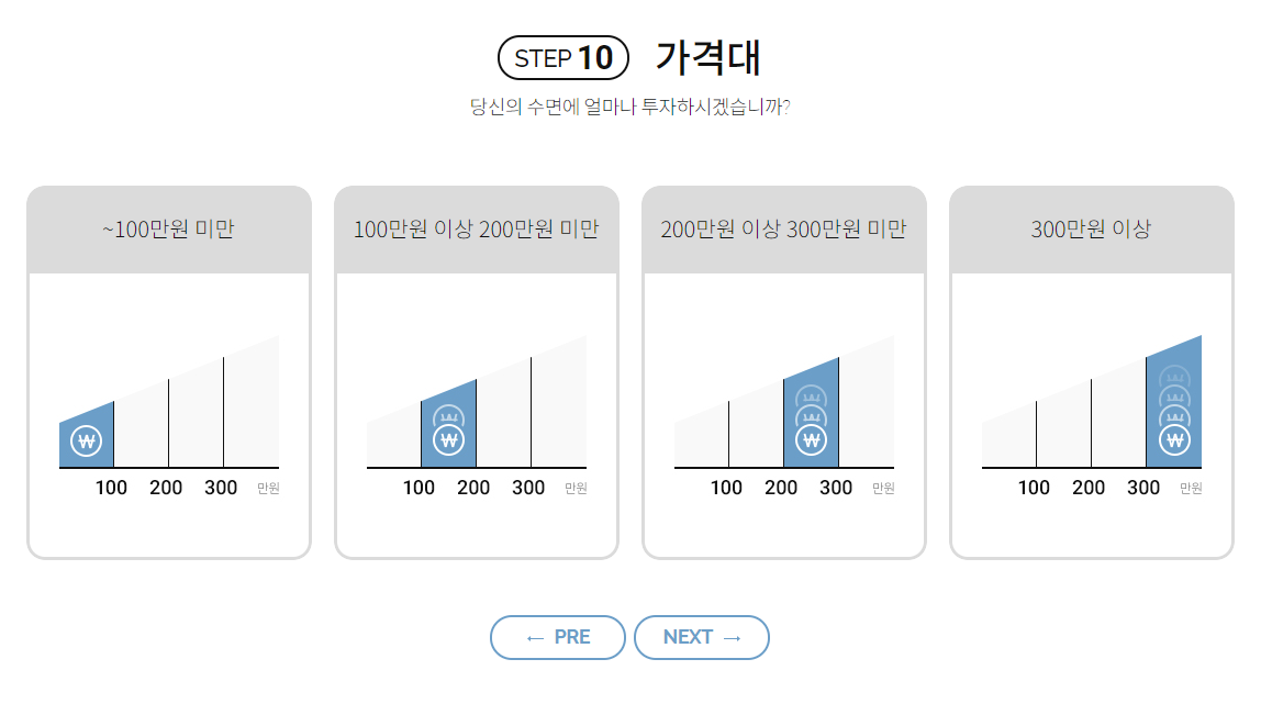 베드셀렉터는 스텝 1부터 10까지 해서 고객에게 질문을 하게 되는데요, 질문 내용은 아래와 같습니다.